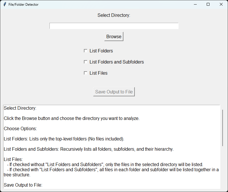 - Save Output to File: The user can save the output in a .txt file, making it easy to document or share directory structures